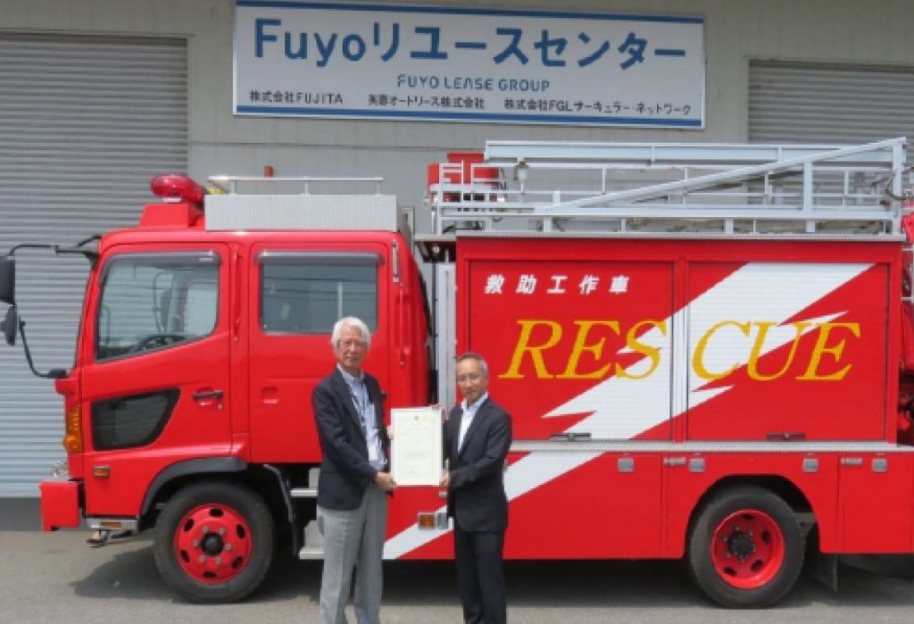 芙蓉総合リース株式会社(東京都千代田区、代表取締役社長 織田寛明、以下「芙蓉リース」)の連結子会社である株式会社FGLサーキュラー・ネットワーク(東京都千代田区、代表取締役社長大木昭彦、以下「FCN」)は、芙蓉リースのリース満了物件である「救助工作車」を一般社団法人日本外交協会(以下「日本外交協会」)へ寄付いたしました。